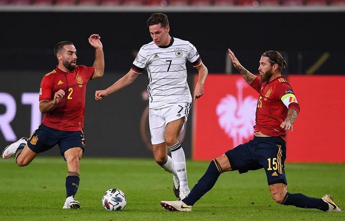 朱利安·德拉克斯勒(Julian Draxler)在欧洲联盟国家杯比赛中与西班牙的丹尼尔·卡瓦哈尔和塞尔吉奥·拉莫斯 竞争